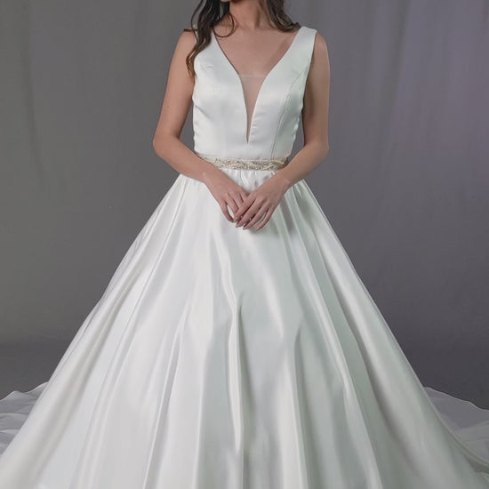 Escote en V, espalda en transparencia con aplicación en pedrería, cauda integrada en razo.