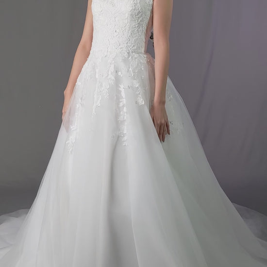 Strapless escote corazón, con tirantes, cauda amplia integrada, en razo con tul y aplicación en encaje.