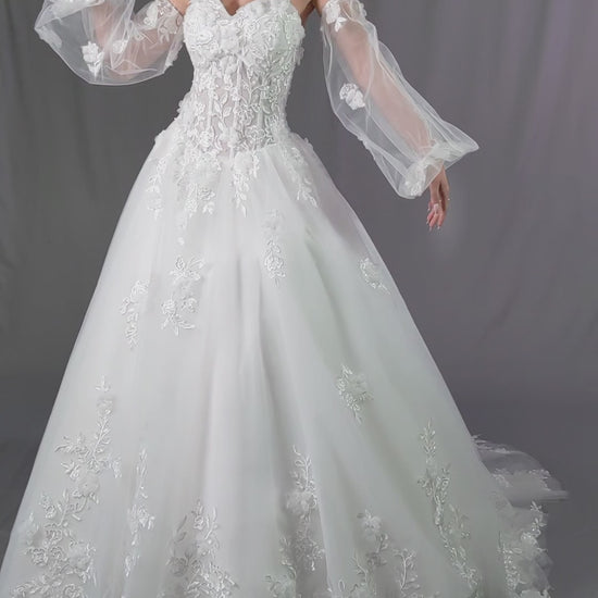 Strapless escote corazón con transparencia, manga larga abombada, cauda integrada en razo con tul y aplicación en encaje.