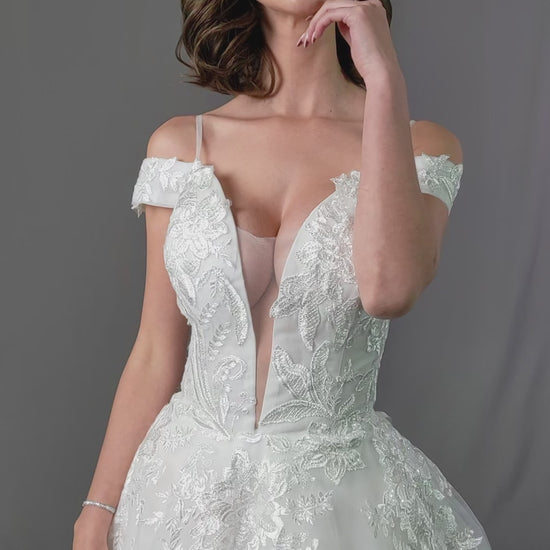 Escote corazón de hombros caídos con transparencia y tirantes, cauda integrada en tul con encaje.