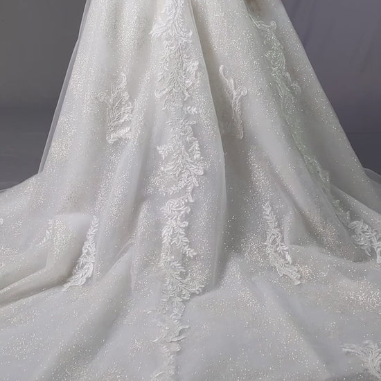 Escote en V con transparencia, espalda ilusión con botones, cauda integrada en razo con tul glitter y aplicación en encaje.